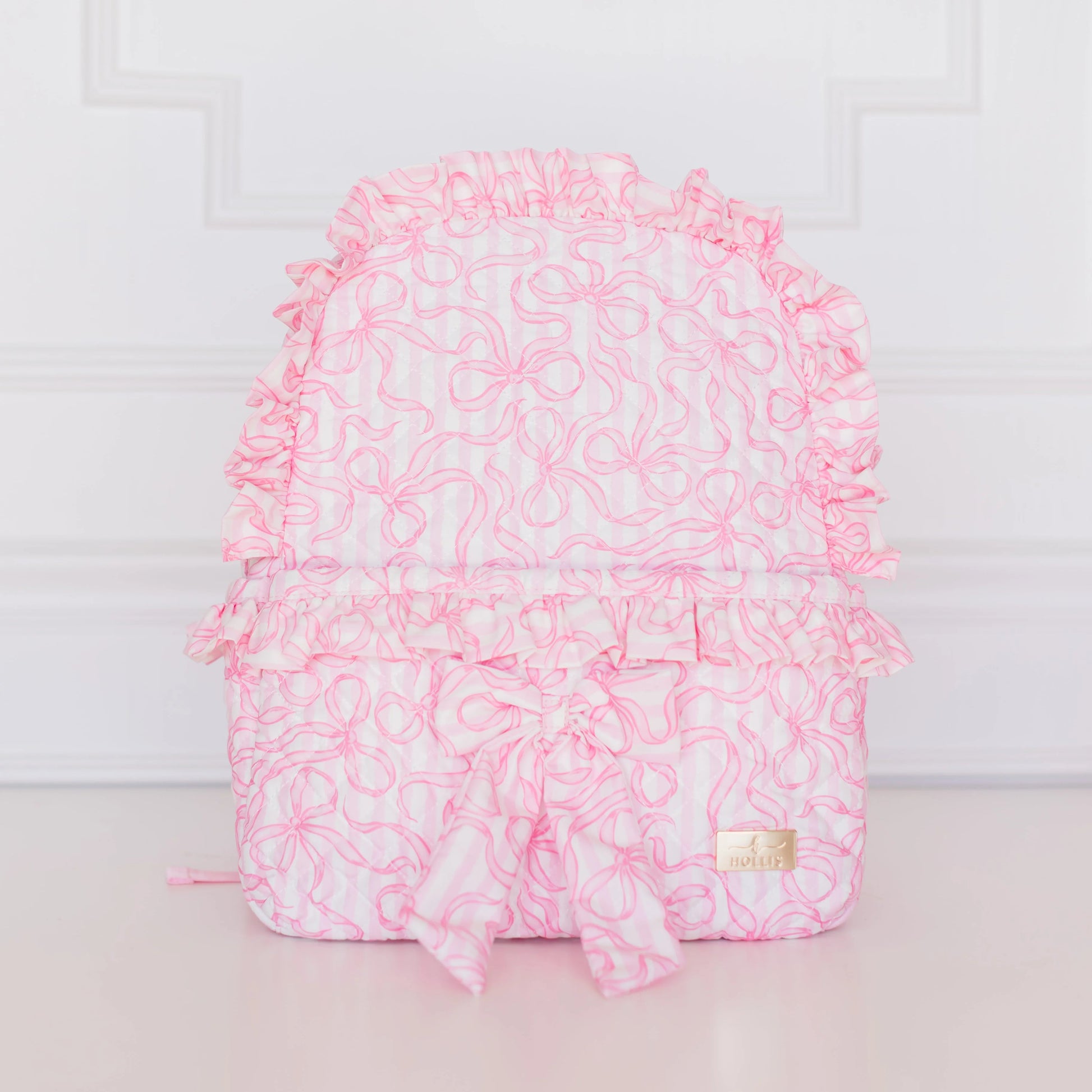 Ruffled trimming along the edges adds the dreamiest texture, while the front is finished with a plush stitched bow for that signature bow-on-bow moment. The spacious interior fits your daily essentials, and the adjustable straps let you carry it comfortably.