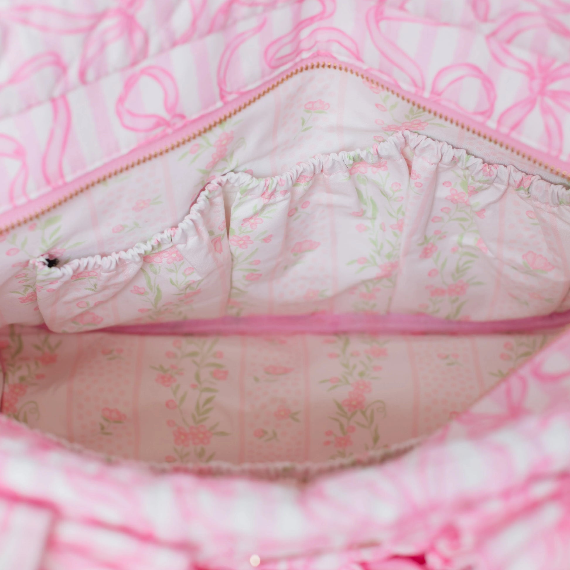 Make motherhood feel magical with the Quilted Coquette Diaper Bag - a gorgeous mix of practicality and pink-bow perfection. Designed in our signature quilted bow print and finished with full ruffled detailing, this bag proves that baby essentials can still be beautiful.